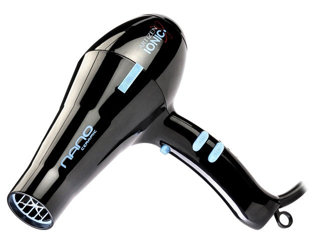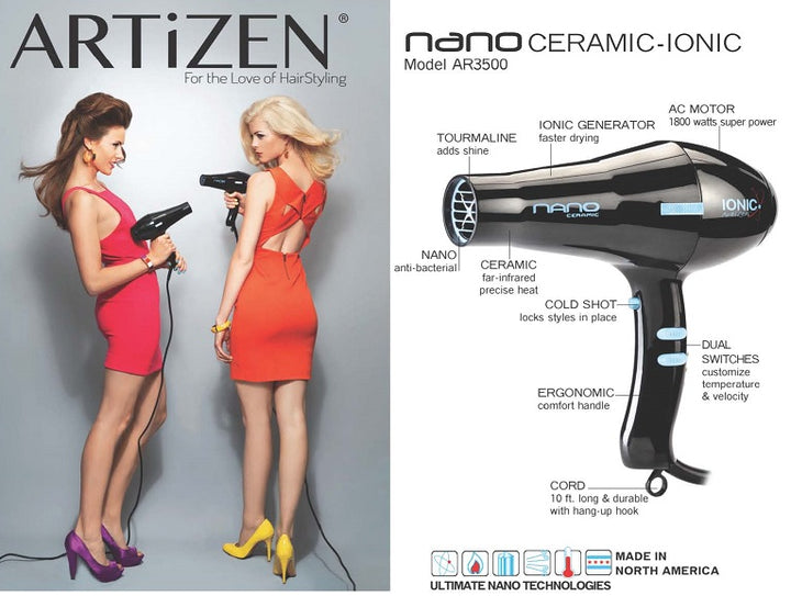 Artizen NANO Ceramic Ionic Hair Blow Dryer AR3500 Black Nano, Ceramic and Ionic technologies are combined to produce the ultimate professional dryer. Negative ions penetrate to the core of the hair shaft and dry the hair from the inside out. Not only does this dry hair faster, but also improves the condition of the hair. Hair looks healthier and shiny after one use. Made in North America. Professional Ceramic Ionic Hairdryer 1800 watts; high air velocity Ceramic, far-infrared precise heat Ion generator & tourmaline for a smooth, shiny finish Long-life AC motor Dual switches have 2 speeds/ 5 heat settings Cold button & 2 concentrator nozzles Made in North America